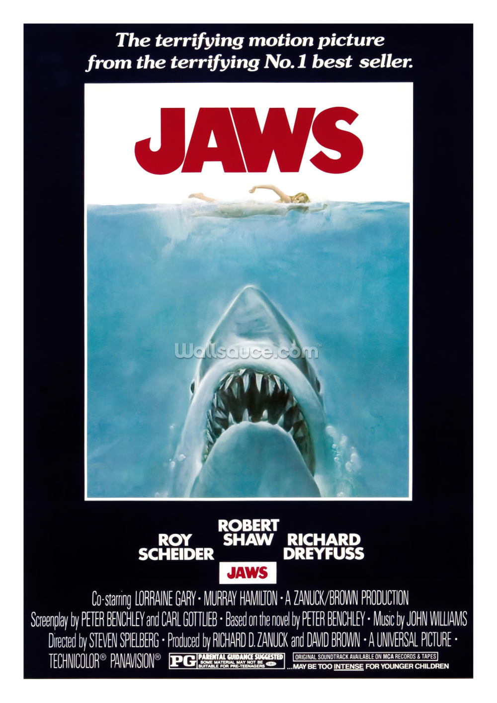 Duunnnnn duunn... duunnnn duun. You know the terrifying theme, now THAT great white shark can transform a wall with our Jaws movie print.It's the film that kept a generation of people out of the water, bring the iconic Jaws movie poster to your wall with this high-quality print. Ideal for bedrooms, cinema rooms or kitchens, show your love of Jaws with this fantastic print.