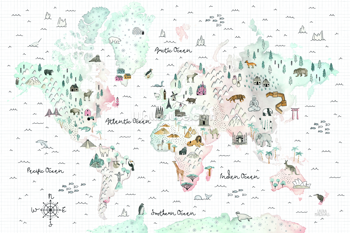 Leve o mundo para o quarto dos seus filhos com este lindo mural de mapas em tons pastel do World Traveller Grid, de Laura Marshall.