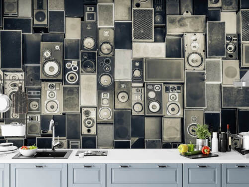 black and white customisable speaker wallpaper called Music Speakers Wall Monochrome for bedroom