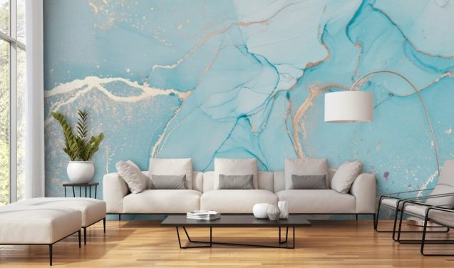 pale blue and gold customisable marble wallpaper mural called Dreamy Blue Watercolour for bedrooms, kitchens or bathrooms