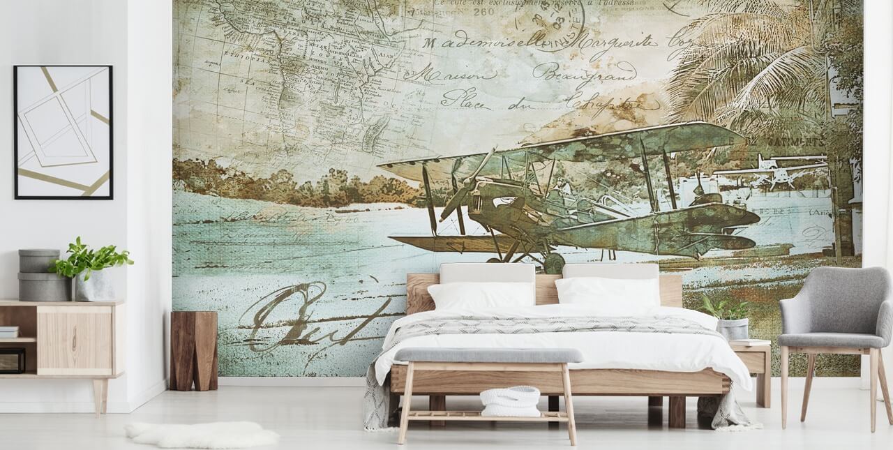 Let your interior design take flight with this stunning Blue Tinted Airplane wallpaper designed by Andrea Haase! With gorgeous tints of blue-green against off-white vintage tones, this stunning airplane wallpaper is not only unique, but it will subtly add colour into any room.