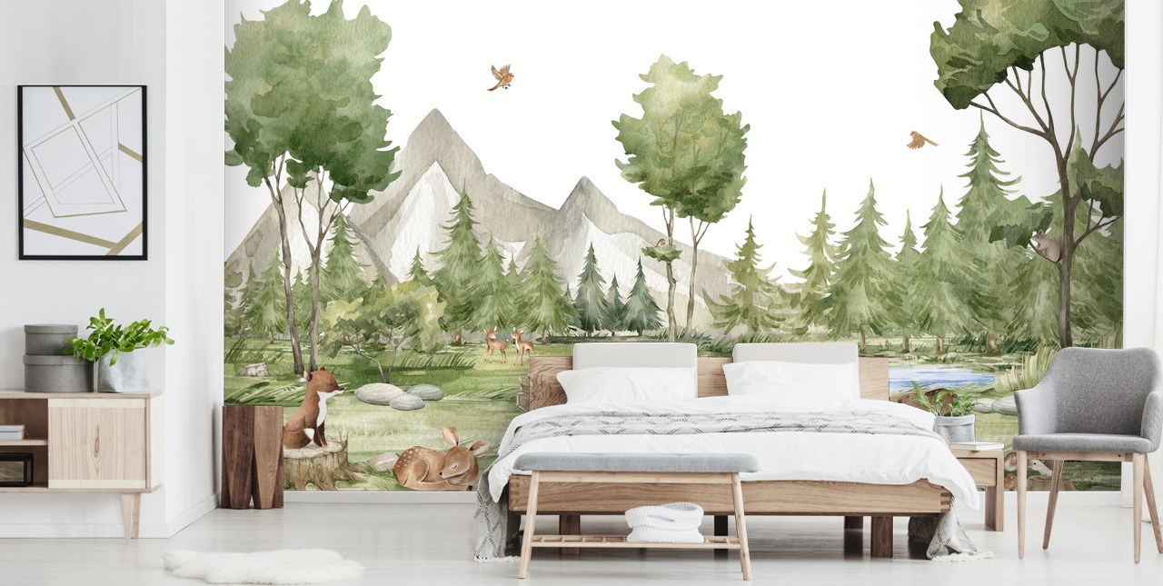 Step into the heart of nature with our whimsical Forest Joy wallpaper mural by Oliver Robins. This captivating wall mural combines the charm of woodland animals and the serene beauty of forest life.