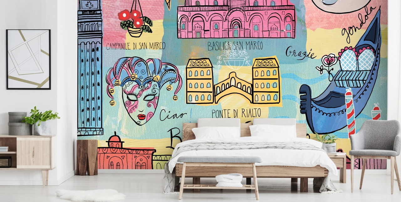 Do you want to show everyone your love for travel? Then choose this custom-made Venice Life wall mural from Wallsauce.com. This Venice wallpaper designed by Farida Zaman is the perfect Italy wallpaper for a kitchen, bedroom, office and more.