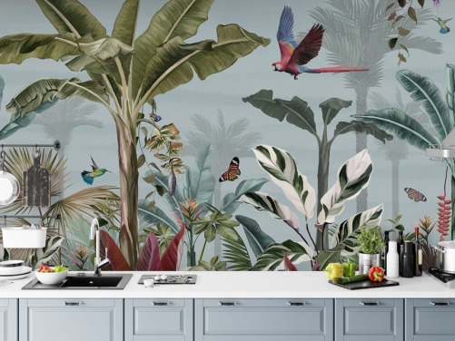 grey jungle wall mural called Jungle Birds and Butterflies Grey at Wallsauce for bathrooms, kitchens and living rooms