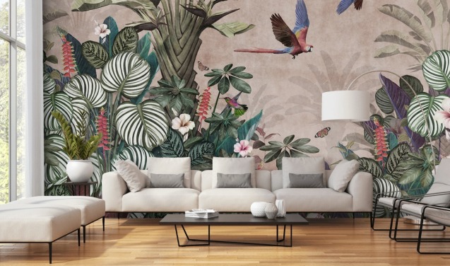 colourful tropical wallpaper mural called Tropical Forest Flowers and Birds at Wallsauce for bedrooms and dining rooms
