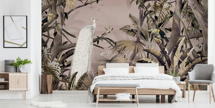tropical forest peacock wallpaper mural called Tropical Forest Peacock at Wallsauce for bedrooms and living rooms