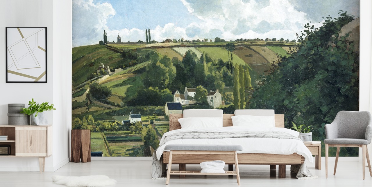 Pissarro’s use of light and shadow brings depth to the scene, while his attention to detail in the foliage and rolling landscape creates a sense of quietude and serenity. The soft tones of green and blue evoke a feeling of calm, making this mural the perfect addition to any room where you want to create a peaceful, relaxed atmosphere.