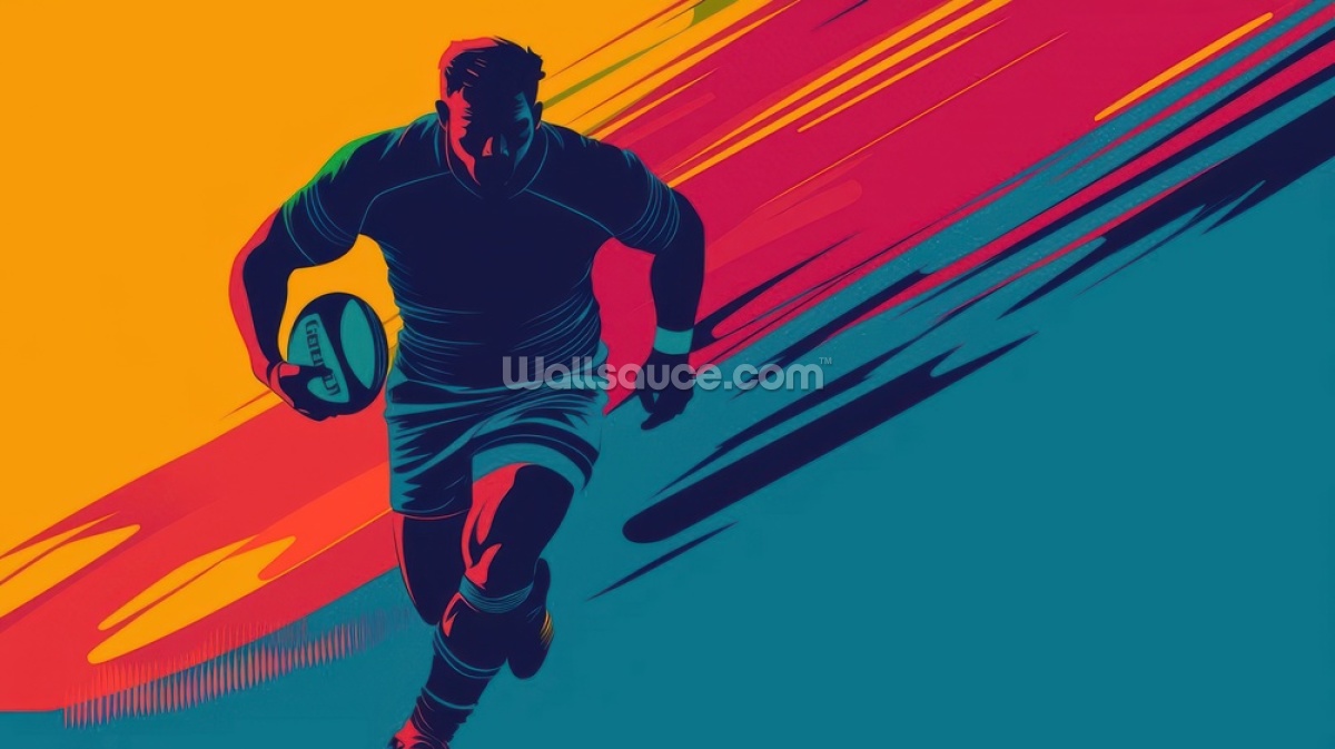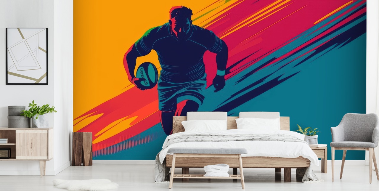 Infuse any space with dynamic energy thanks to the captivating and colourful Rugby Silhouette wallpaper mural at Wallsauce.