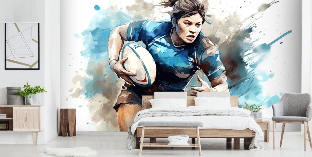 Featuring a watercolour image of a sprinting rugby player, this mural captures the raw energy and excitement of the sport. It is perfect for rugby clubs, schools, home gyms or a young athlete’s bedroom, creating an inspiring backdrop that celebrates strength and determination.