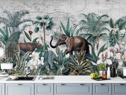 illustrated dressed elephant, peacock and monkey in flowered jungle wallpaper