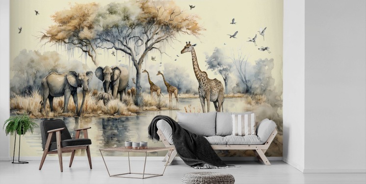 Illustration of Elephants and Giraffes on Safari wall mural