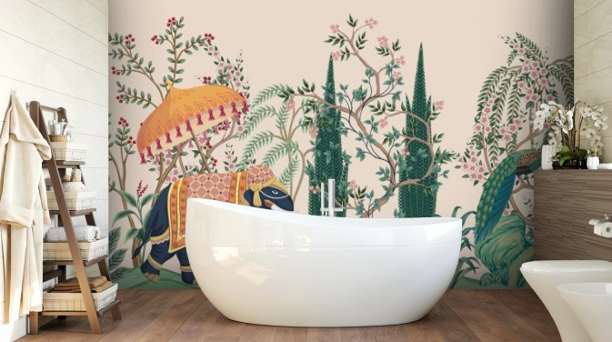 colourful chinoiserie wallpaper mural called Chinoiserie Elephant and Peacock for bedrooms and living rooms