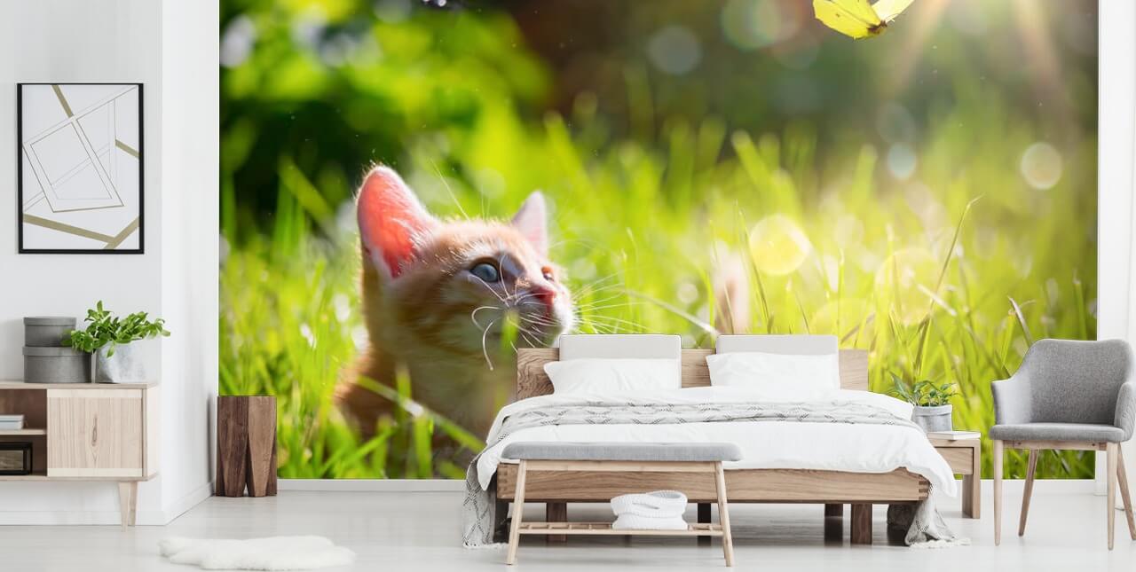 Be wowed at how cute this Kitten Hunting a Butterfly wallpaper is! The perfect choice for a child's bedroom, why not install this ginger cat wallpaper on the wall next to their bed so they can look up at it as they fall asleep?