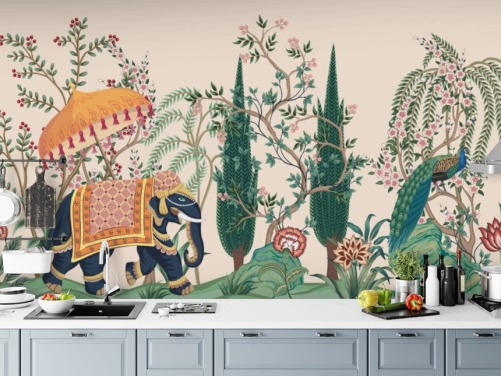 colourful chinoiserie wallpaper mural called Chinoiserie Elephant and Peacock for bedrooms and living rooms