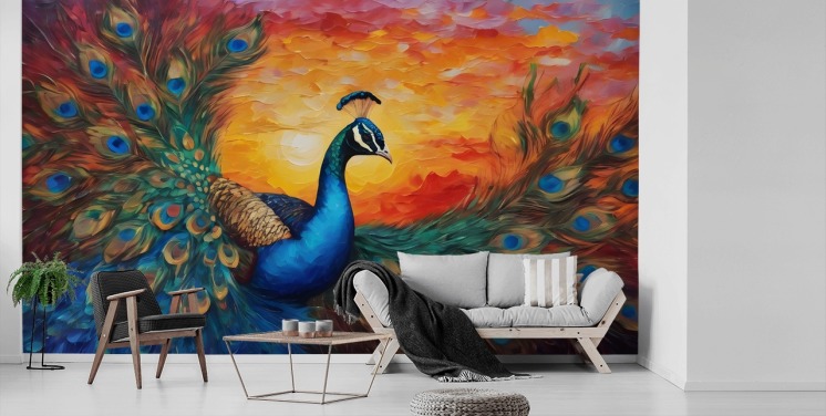 colourful peacock wallpaper mural called Painted Peacock Sunset for bedrooms, living rooms and offices