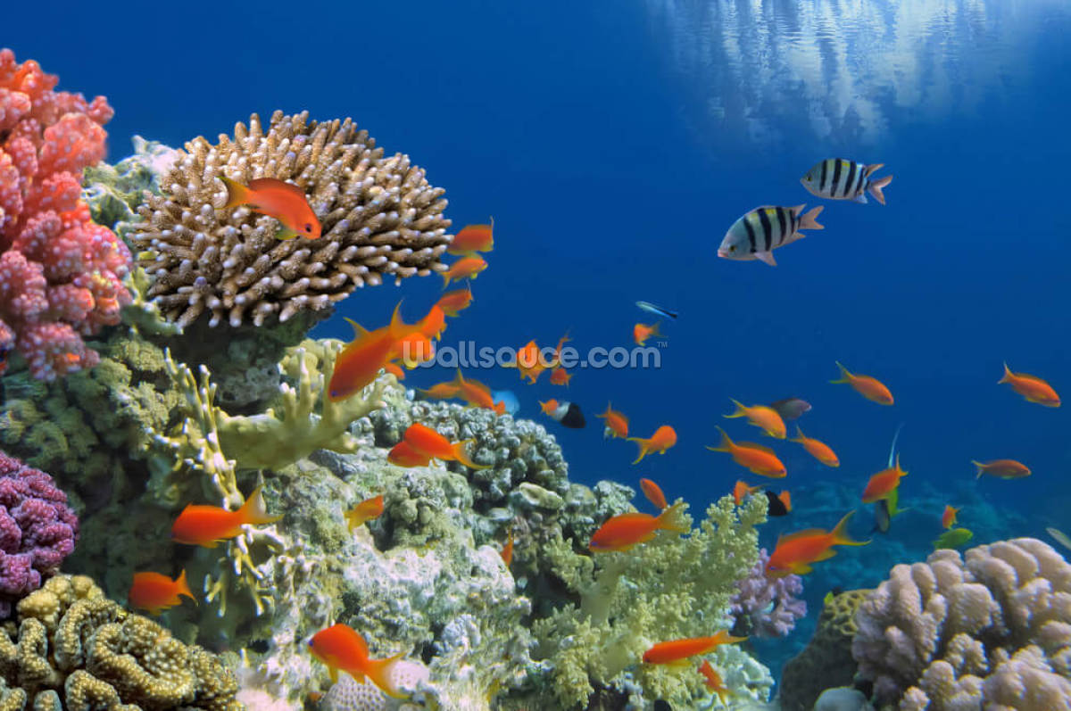 Enjoy this beautiful Tropical Fish on Coral Reef wallpaper mural in your home. With beautiful shades of orange, blue and pink, this fish tank wallpaper would look gorgeous in a bathroom. Place it on the largest wall in the room to make the most of this stunning fish wallpaper. Paint the walls off-white and have sea life-themed décor throughout the room. Choose a tropical fish shower curtain and toilet seat!