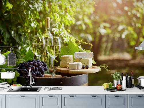 Two Glasses of Wine and Cheese on a Barrel Wallpaper