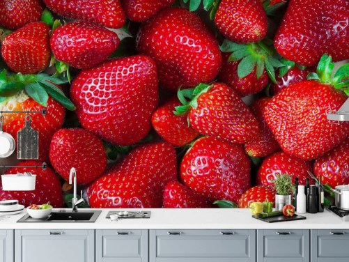 bright red fruit wallpaper mural called Strawberries Fresh for kitchens, cafes and restaurants