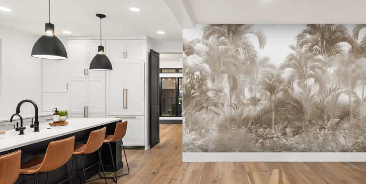Panoramic muted green and grey jungle wallpaper with tall palm trees