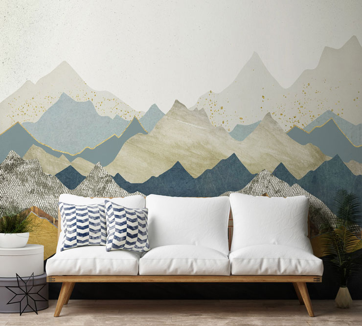 abstract mountain view with marble textures wall mural with white and blue sofa