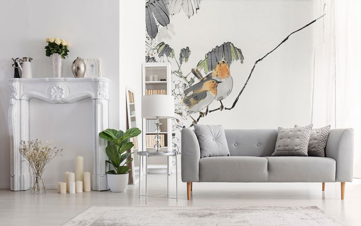 oriental orange breasted sparrows on branch minimalist wallpaper in quaint white and grey living room