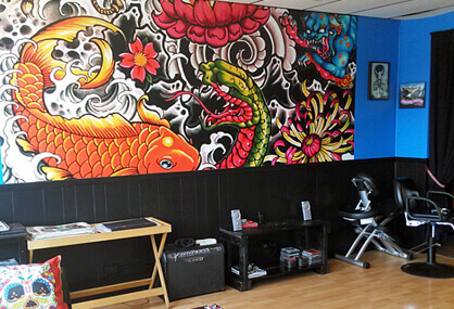 The chosen mural - a vivid, abstract composition - transforms a once-plain wall into a dynamic statement piece that echoes the shop's playful personality.