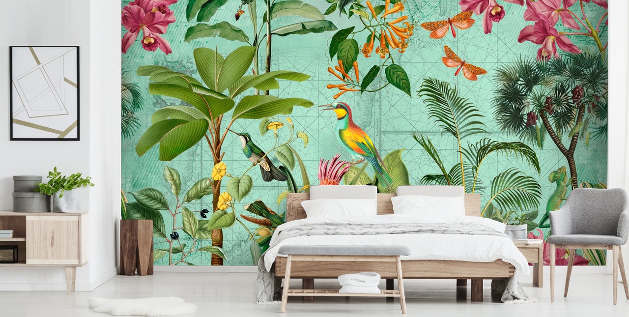 Bring the Tropical Paradise jungle vibes of this mural into your home to create a vibrant and naturally inspired space. Includes beautiful tropical birds and colourful floral illustrations.