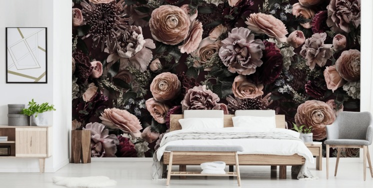 dark floral wallpaper mural called Vintage Flower Meadow by Andrea Haase for bedrooms, living rooms and dining rooms