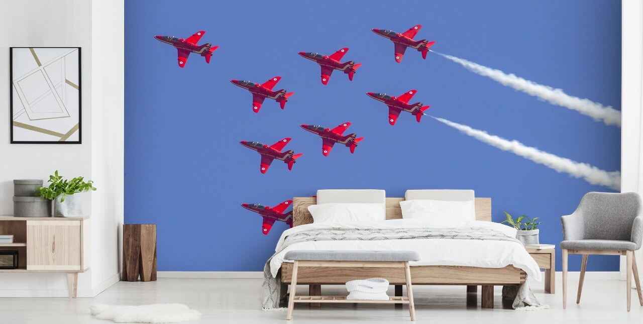 Stunning The Red Arrows aerobatic team formation wall mural. This high-quality wallpaper is custom made to your dimensions.