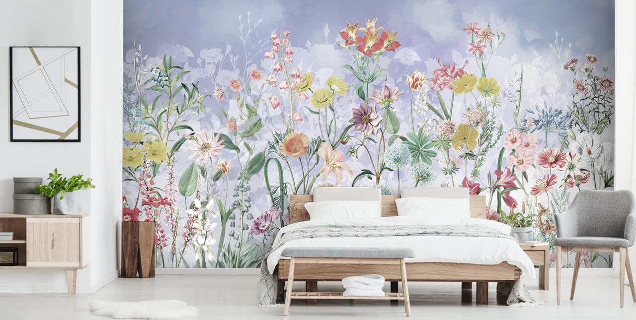 If you adore floral art, then embrace this stunning Primula wallpaper in your home. This Marina Stupakova design is ideal for a rural-styled bedroom. Simply paint the surrounding walls white and choose farmhouse-style furniture painted white. Opt for white bedding with subtle floral patterns on it as well as pretty floral curtains to mirror the flowers in this design.