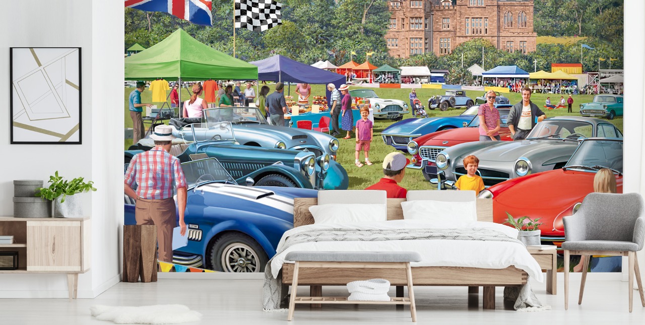 Vintage Car Show is a beautifully charming care home wallpaper from artist Victor McLindon.