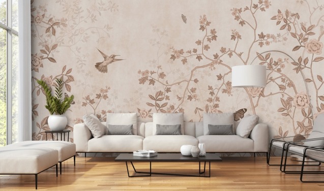 beige jungle wall mural called Beige Birds and Butterflies at Wallsauce for bedrooms, bathrooms and hallways