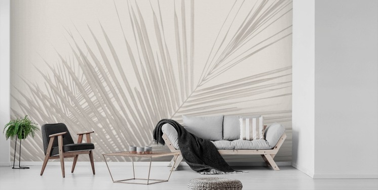 sepia tropical wallpaper mural called Sepia Palm Leaves and Butterflies at Wallsauce for home offices, bathrooms and kitchens