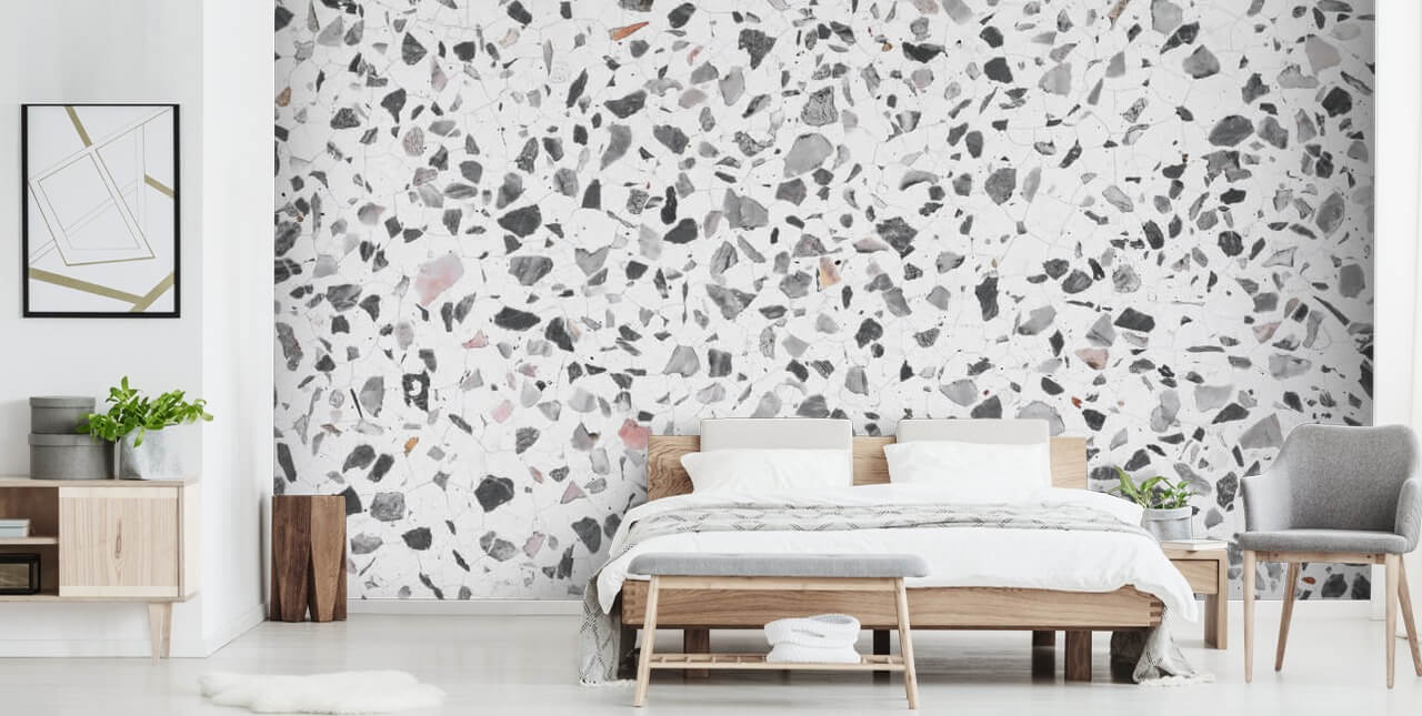 Love grey and white, but want a unique wallpaper instead of plain painted walls? Then choose this stunning Grey and White Terrazzo wall mural for your home.