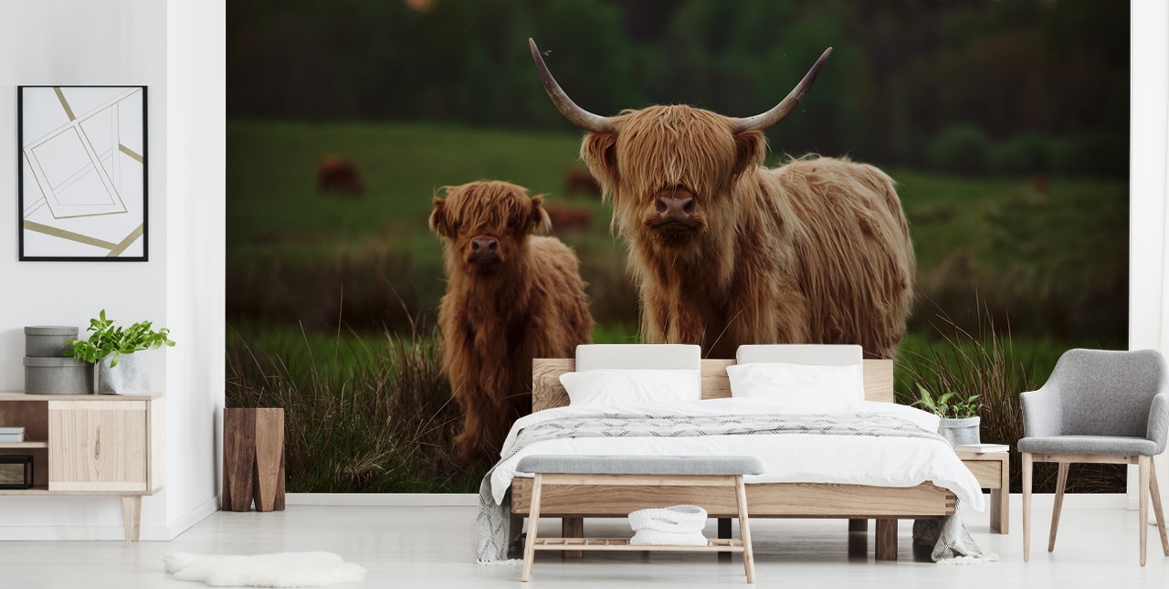Highland Cow and Calf is a cute cow wallpaper mural that will add character and personality to any room in your home, office or business.