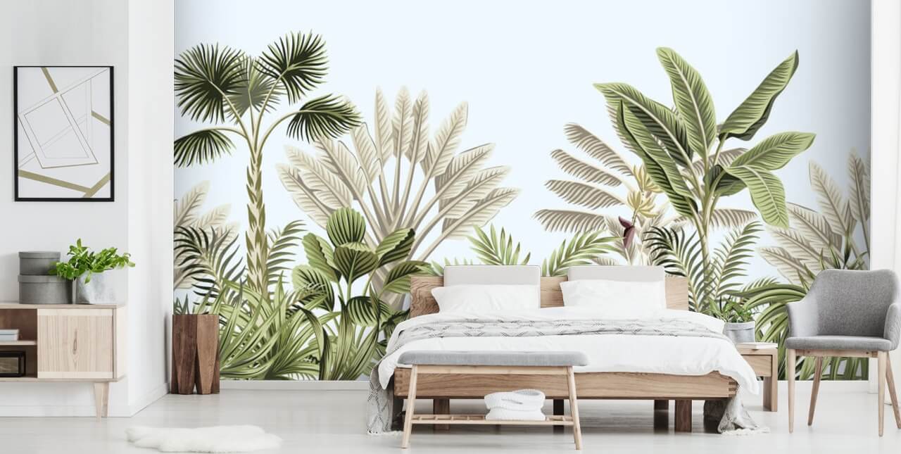 This tropical In the Jungle wallpaper is abundant with luscious greens and powdery blues. Both these colours are extremely relaxing as well as on-trend. To mirror the jungle ambience of this palm leaf wallpaper, have a small selection of leafy green plants. Don't forget to include other natural fibres in your choice of room accessories – wicker or rattan mats and lamps shades would look ideal.