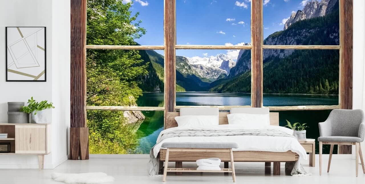Stunning Lake and Mountain View Window wallpaper. Custom-made to fit your wall's dimensions.