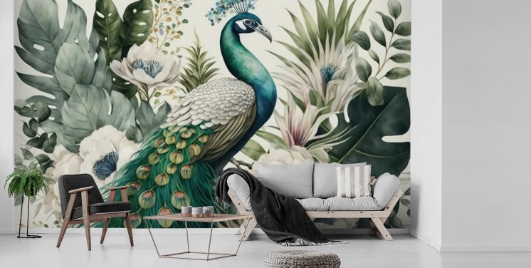 Transform your space with a beautiful peacock wallpaper mural. Peacocks represent beauty, renewal, and confidence. Their stunning look adds elegance to any room, whether a bedroom, living room or home office.