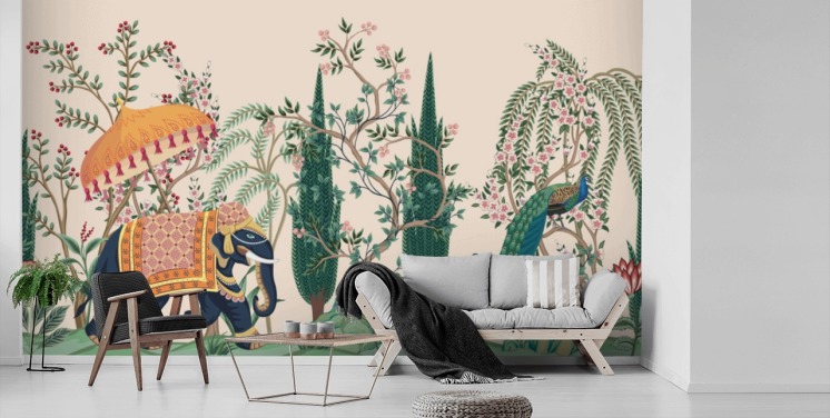 colourful chinoiserie wallpaper mural called Chinoiserie Elephant and Peacock for bedrooms and living rooms