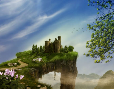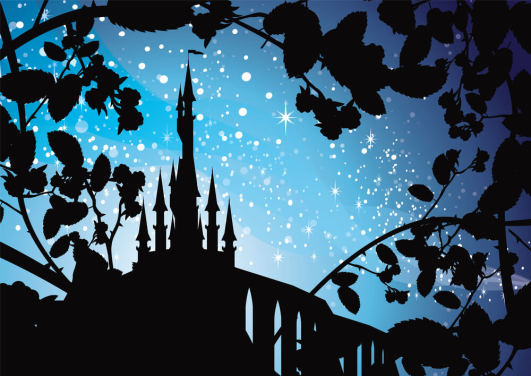 sunset sky with fairy tale castle and silhouette of prince and princess on hill looking over it all wallpaper
