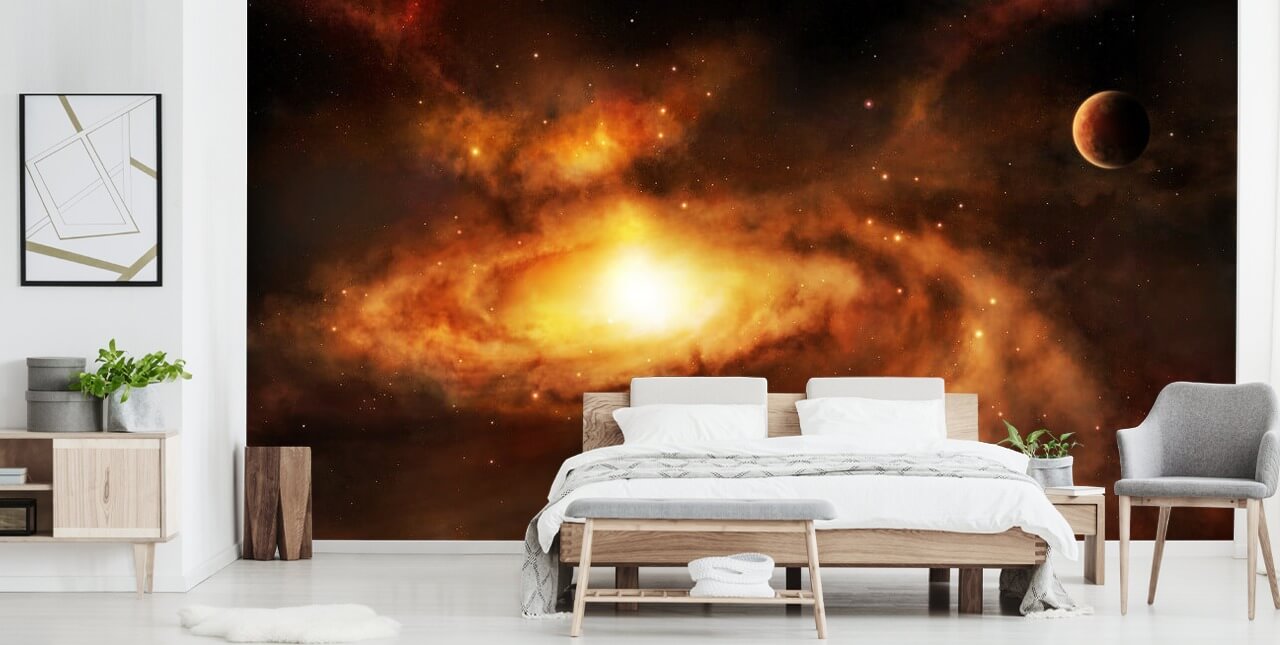 Bring your home’s interior design to a completely new level with this stunning Spiral Galaxy Nebula wallpaper in your home. Rich in tones of burnt-orange, yellow and inky-orange, this gorgeous nebula wallpaper won’t just please space enthusiasts.