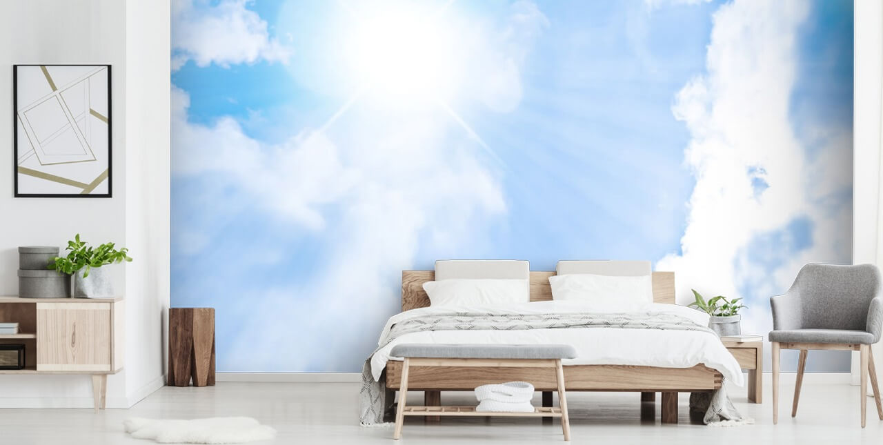 Install this perfect blue sky wallpaper in a room with white painted walls. To reflect the blue shades in the mural, find a few blue room ornaments or room accessories to really make this beautiful wallpaper pop! Accent cushions, rugs and blankets are great options to instil a bit more colour into your room.