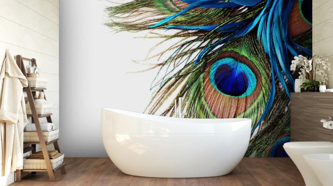 green and blue customisable peacock wallpaper called Fantastic Peacock Kings for kitchens, living rooms and bedrooms
