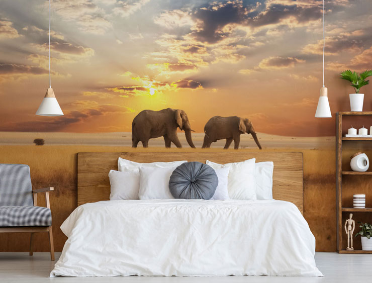 two elephants walking in dry landscape under sunset sky wall mural in stylish master bedroom