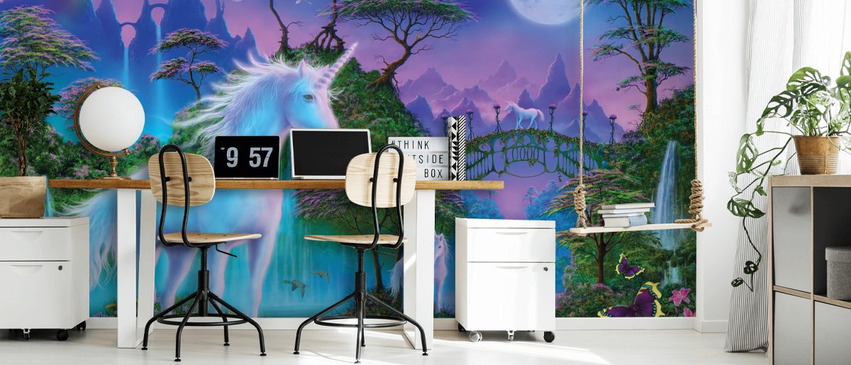 Send yourself into another world with this fantastical Unicorn Bridge wall mural! Design by Danny Flynn, this amazing unicorn wallpaper will certainly make your child’s dreams come true!