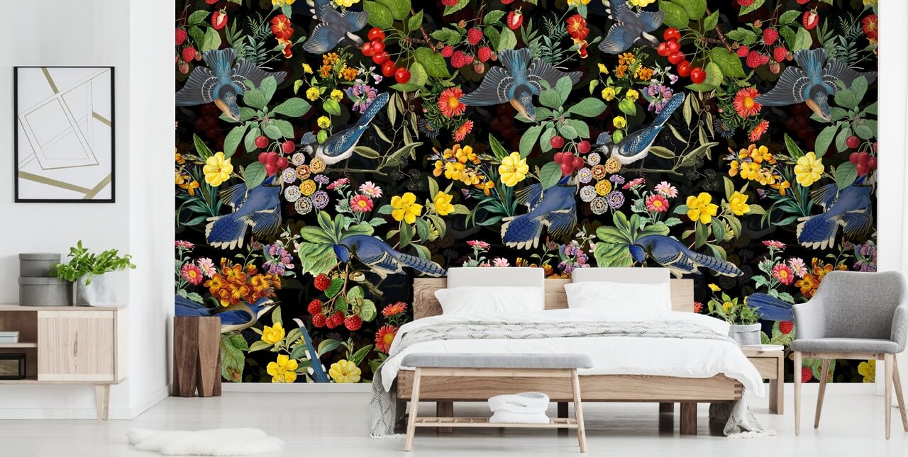 Bring dark floral beauty into your home with this made-to-measure Dark Floral Blue Birds wallpaper mural.