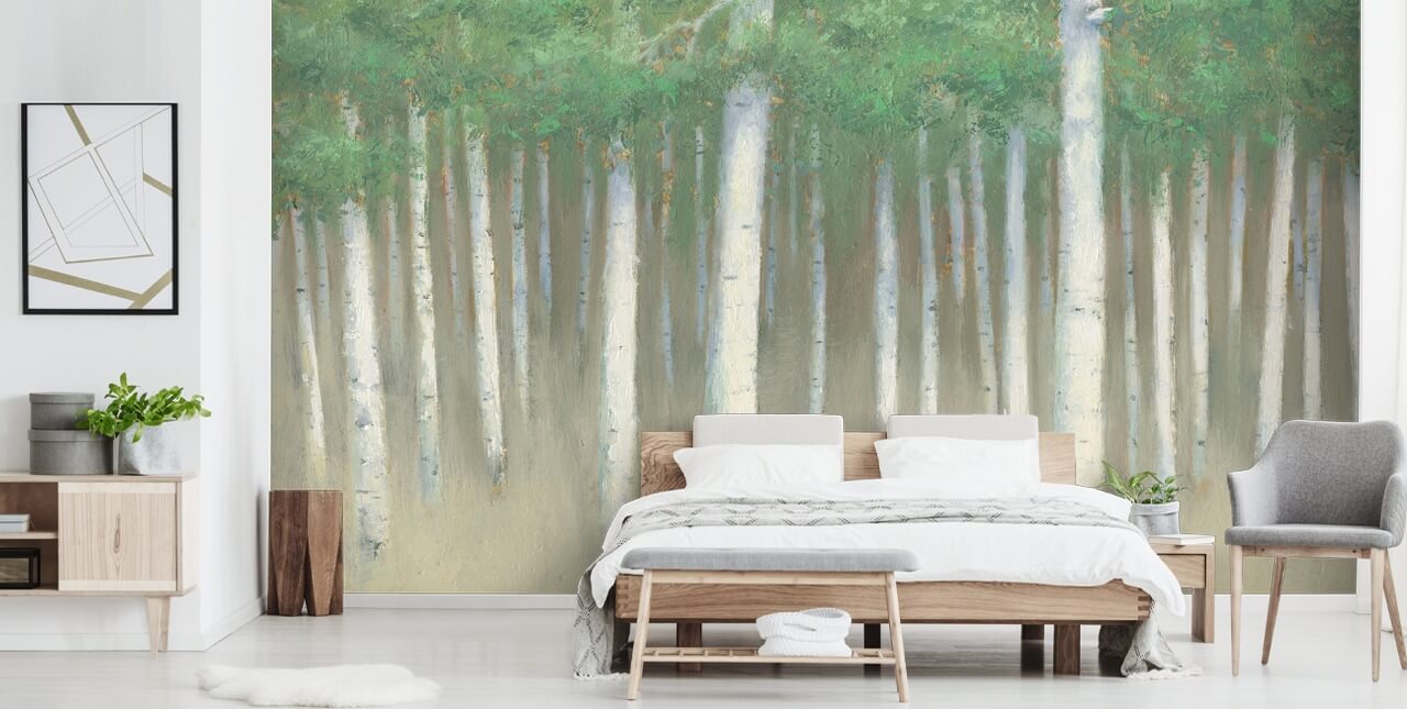 Enjoy this gorgeous Green Forest Hue wall mural from Wallsauce.com. The perfect birch forest wallpaper for your relaxing bedroom.