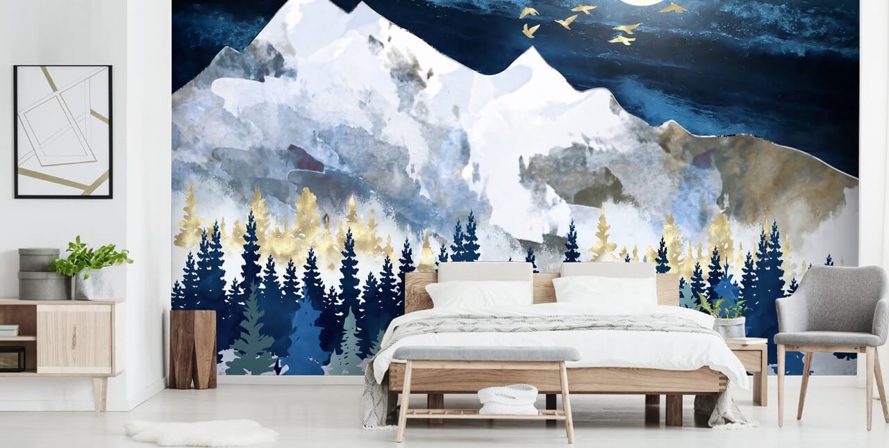 If you want a gorgeous navy wallpaper, then choose this beautiful Moonlit Snow wall mural. We think that this modern mountain wall mural would look fantastic in a navy living room. Choose an inky blue couch to mirror the colour of the trees and incorporate golden décor, such as a lamp, to reflect the gold of the trees.
