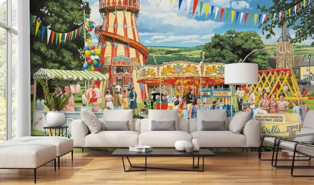 colourful bygone era wallpaper mural called The Village High Street by Trevor Mitchell for care homes
