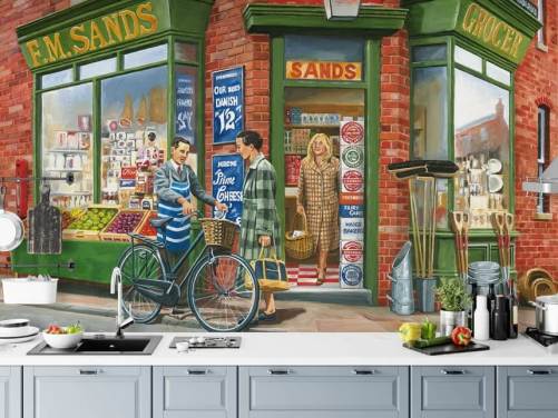 colourful bygone era wallpaper mural called The Sweet Shop by Trevor Mitchell for care homes